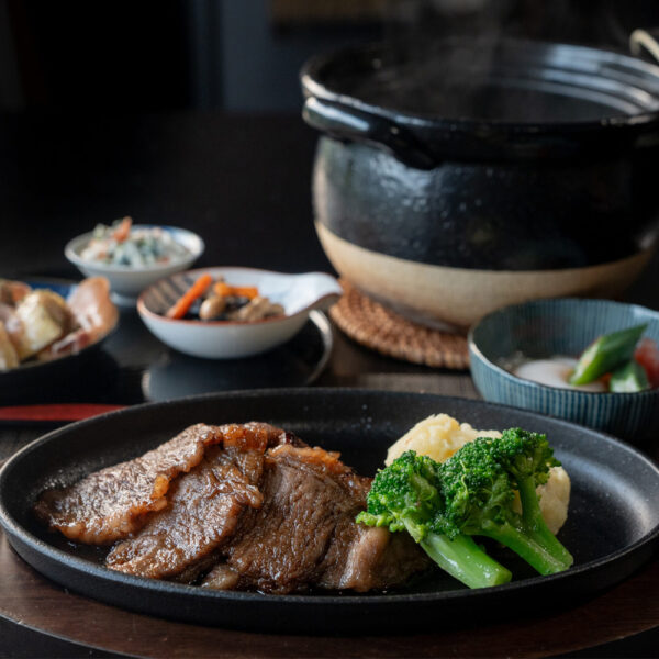 若狭牛A5ランク上ロース肉を特製タレでグリルした熱々鉄板コース。こだわりのサイドディッシュを揃えた贅沢なプラン。