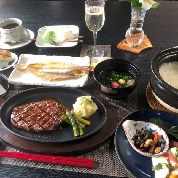 メインは若狭牛A5ランク絶品ステーキ。旬の鮮魚グリル、若狭名物焼き鯖寿し、地元新鮮野菜の小鉢など、若狭の美食御膳をご堪能ください。